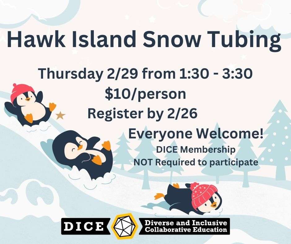 This will be the last chance of the season to join us for snow tubing at Hawk Island Park on Thursday 2/29! Registration Deadline is 2/26. Don’t let that weather fool you! They make snow!